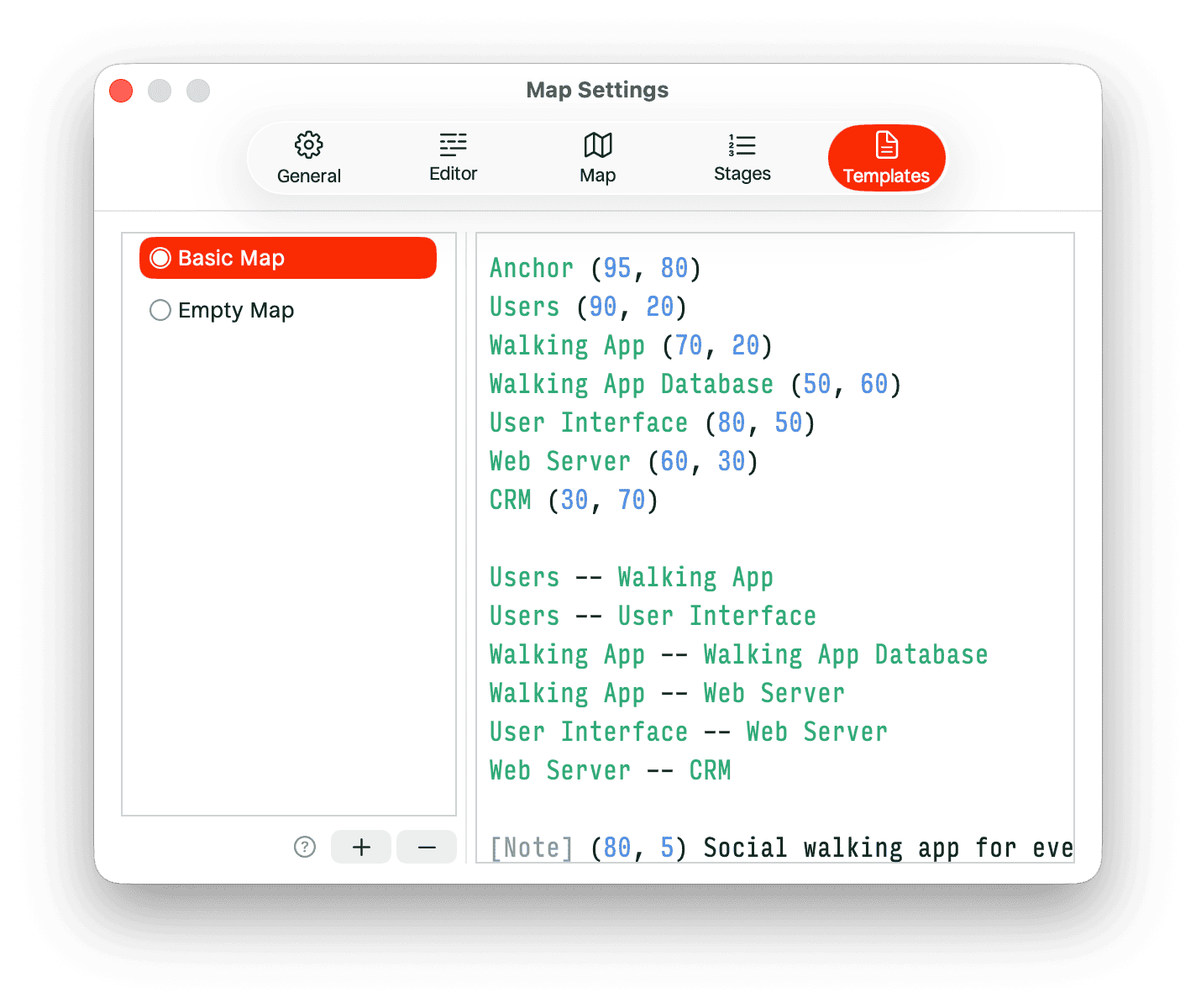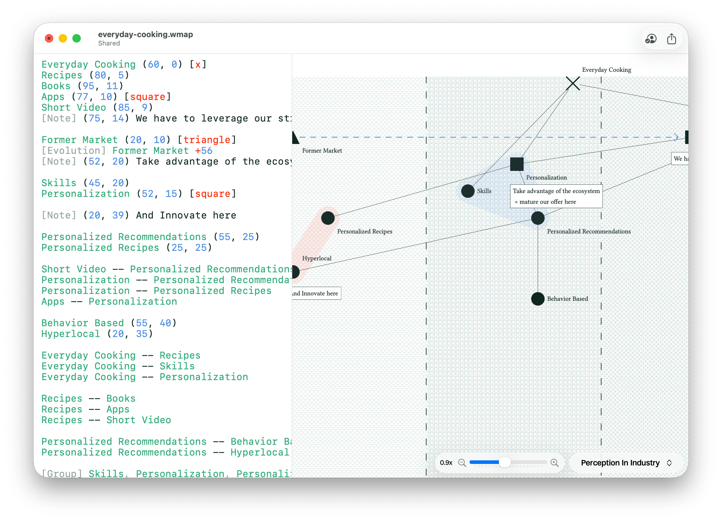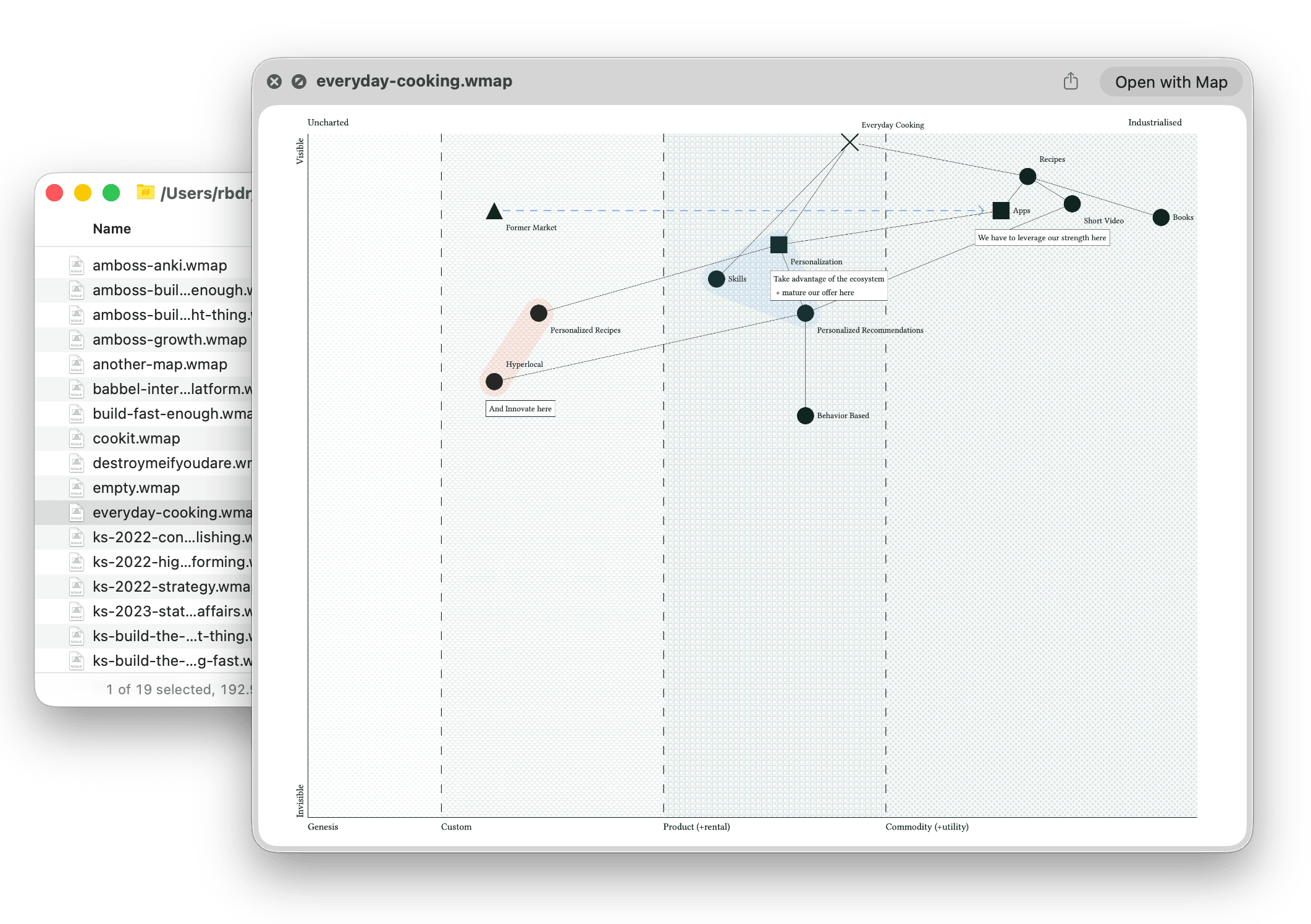 Map is a wardley map editor for macOS that uses a simple language to easily create and edit maps. Draw components, link dependencies, create groups, write notes, or add inertia and evolution markers, and see your map change in an instant.